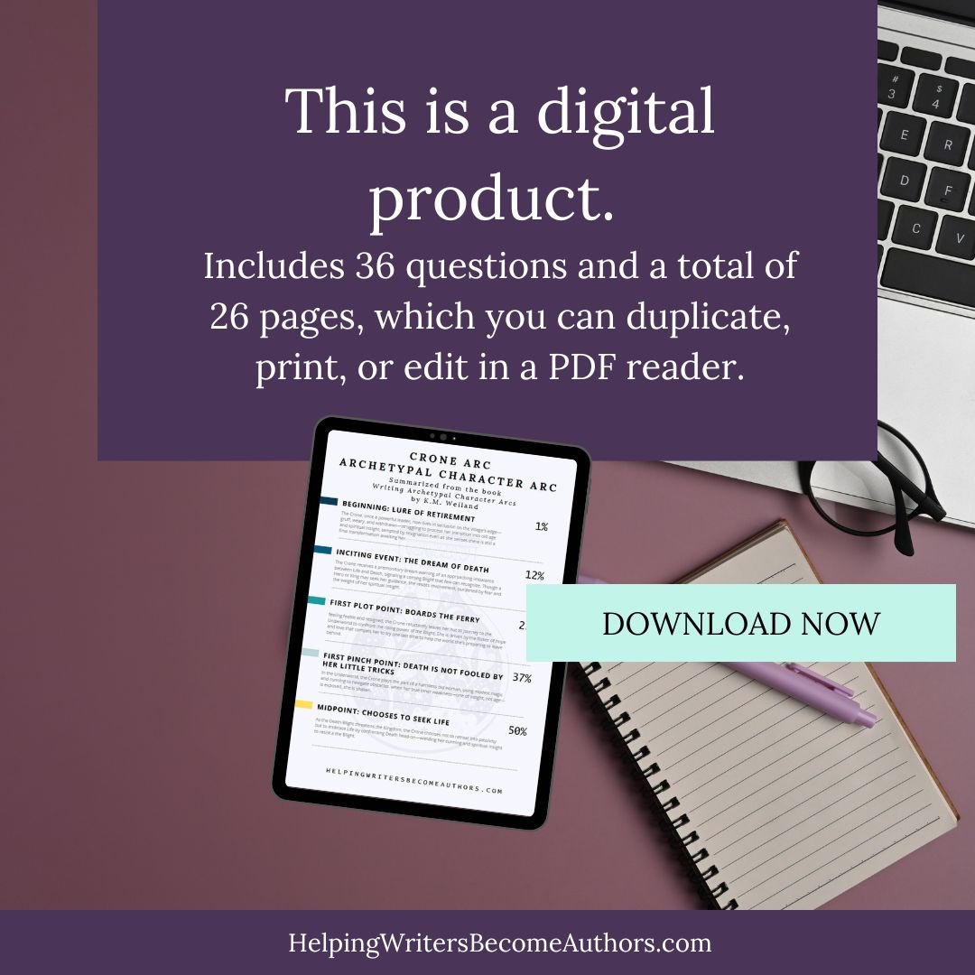 Craft powerful stories with retired or reclusive protagonists using the Crone Arc Workbook, a comprehensive 24-page character arc planner and beat sheet designed for writers developing hermit or sage archetypes. Created by K.M. Weiland—author of Creating Character Arcs and Writing Archetypal Character Arcs—this digital worksheet guides you step by step through a full narrative transformation for characters in their later life stages. Whether you’re writing a retired adventurer, grandparent, village healer, or post-power ruler, this planner helps you map a meaningful arc focused on wisdom, renewal, and legacy.