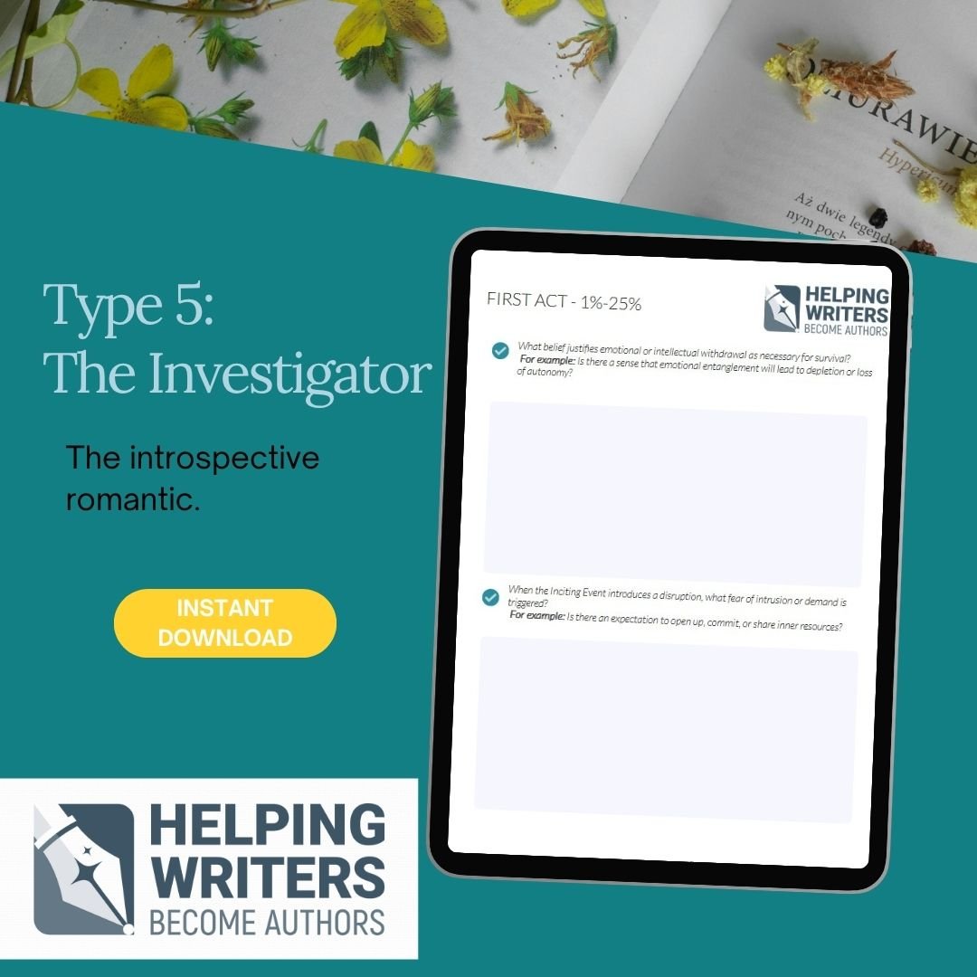 This guide by K.M. Weiland (author of Creating Character Arcs) will help you chart how a Type 5’s core fear (of being overwhelmed or incapable) and core desire (to be competent and informed) can drive a Positive Arc of engagement and wisdom or a Negative Arc of isolation and detachment.