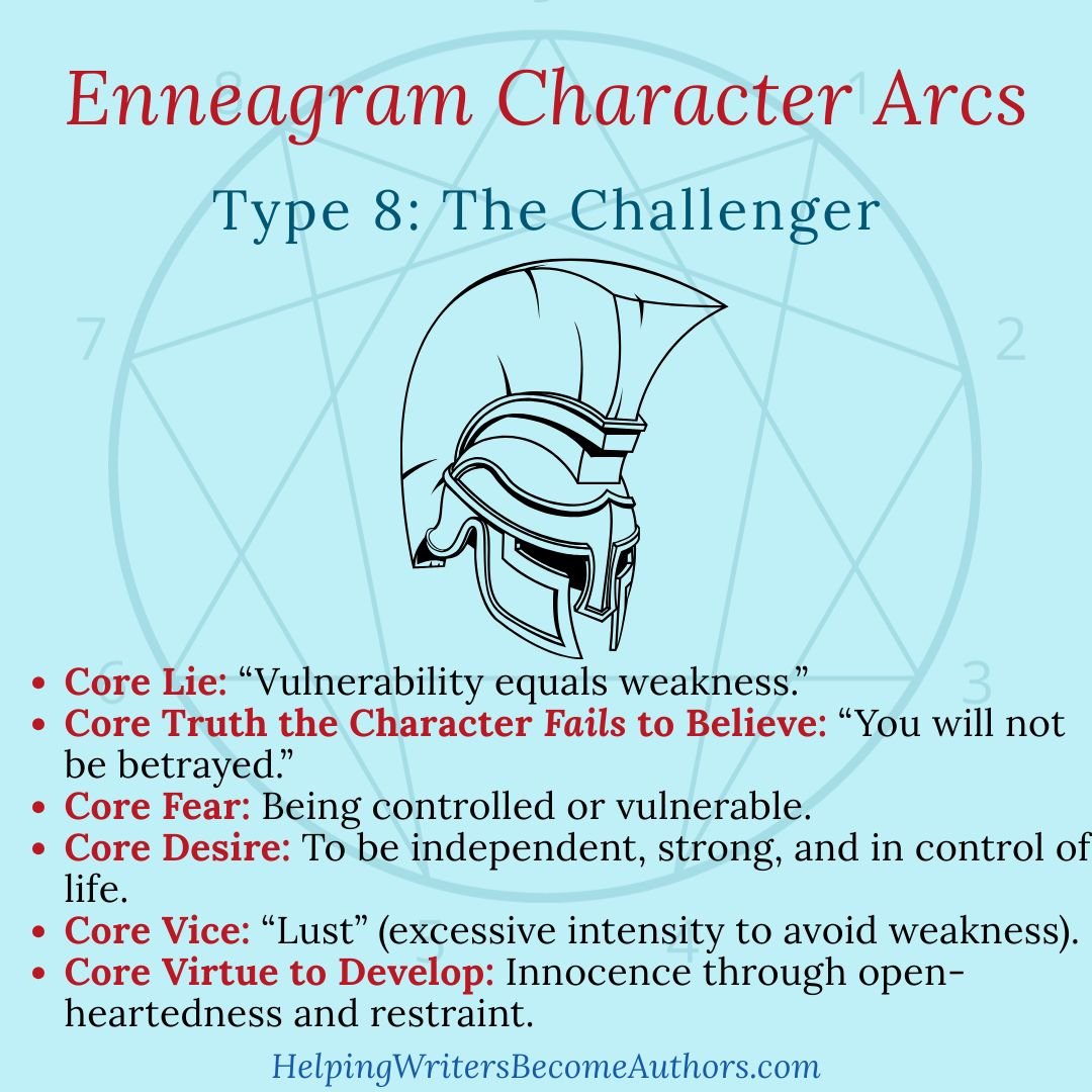 This guide by K.M. Weiland (author of Creating Character Arcs) outlines how a Type 8’s basic fear (of being controlled or harmed) and desire (to protect themselves and determine their own path) can drive a Positive Arc of tempered strength and compassion or a Negative Arc of domination and fallout.