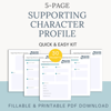 - Flexible Format: The Supporting Character Interview Worksheet comes as a fillable PDF (with optional Word document). The questions are arranged by category, making it easy to fill out. You can complete only the parts you find relevant – the worksheet is intentionally flexible, acknowledging that not every side character needs the same level of detail. Use it for your more prominent secondary characters or for any minor character you’re struggling to understand. Because it’s reusable, you can print it or duplicate the file for as many characters as you need in your project.